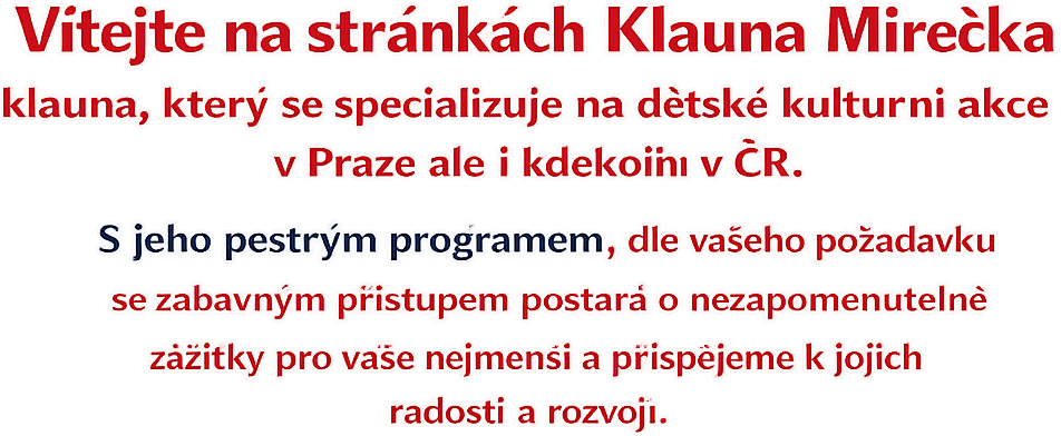 Jsme zkušený tým specializující se na dětské kulturní akce v Praze i po celé republice. Přinášíme dětem nezapomenutelné zážitky plné smíchu, her a soutěží a společně s klaunem Mirečkem otevíráme světy fantazie, radosti a dobrodružství.